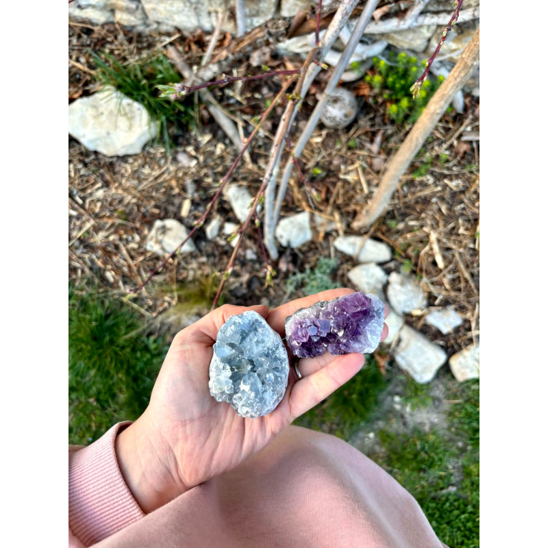 Drúza celestinu je nádherný přírodní kámen v uklidňujících odstínech světle modré, který na první pohled vyzařuje jemnost, čistotu a klid. Její třpytivé krystaly připomínají kousek nebe zachycený v minerálu...a právě proto si získala srdce mnoha žen, které hledají harmonii, zpomalení a hlubší spojení se sebou samými...