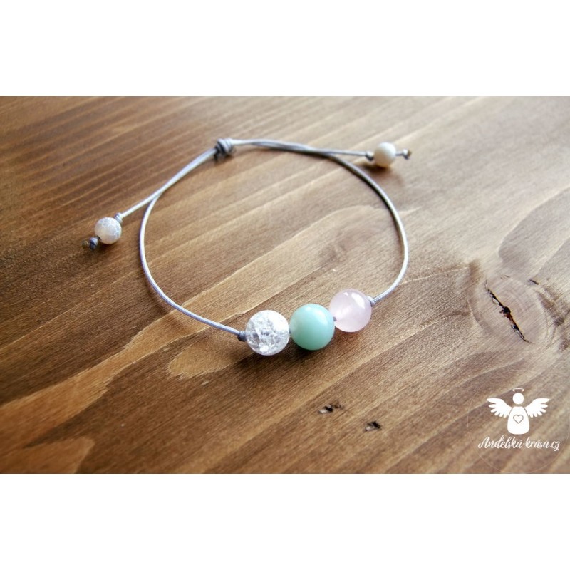 Náramek ručně pletený s minerály (kalcit, růženín, křišťál).