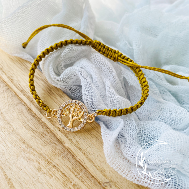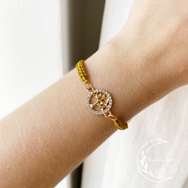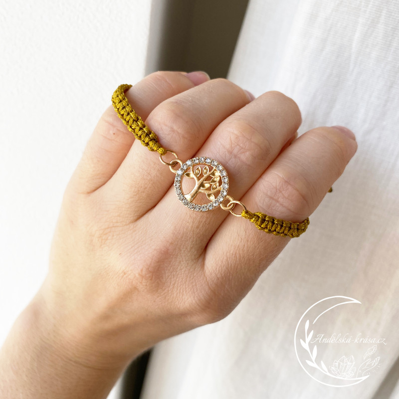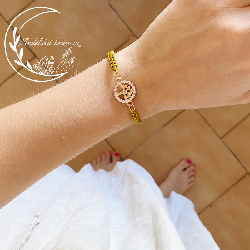 Harmonizační náramek s pleteným řemínkem v hořčicově žluté - zlaté barvě se Stromem Života.