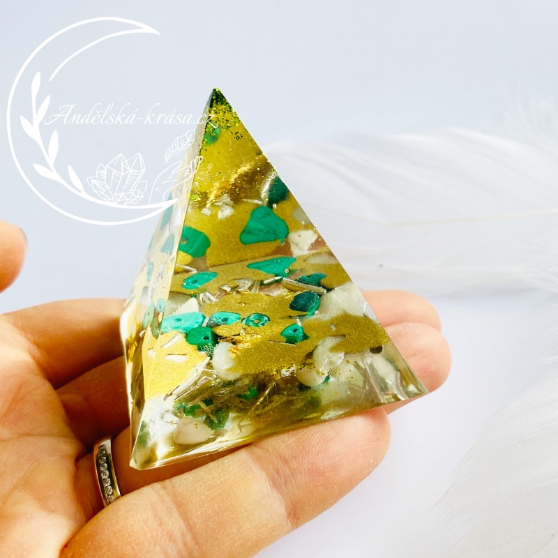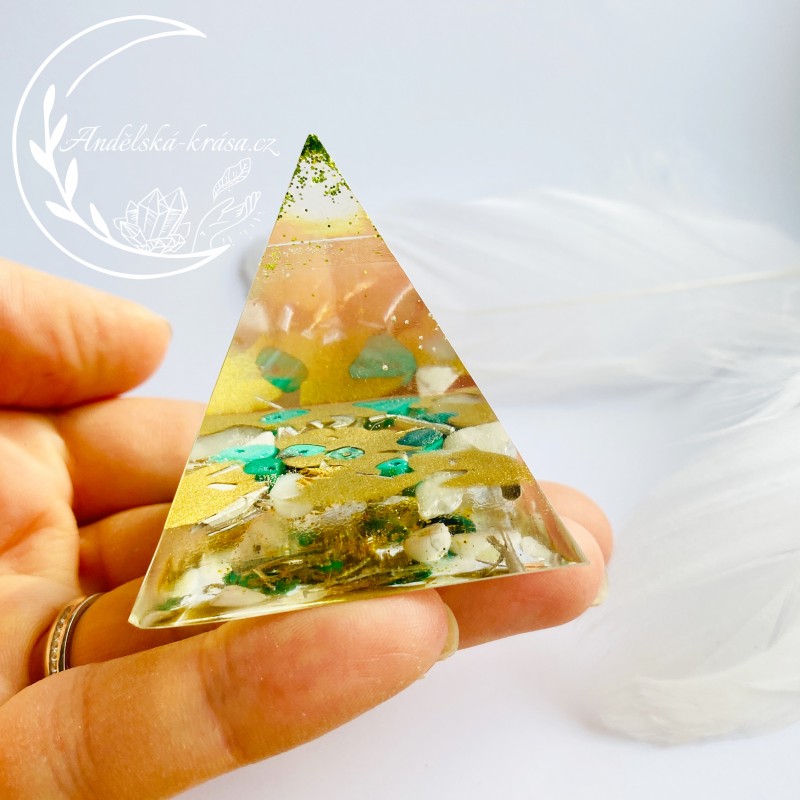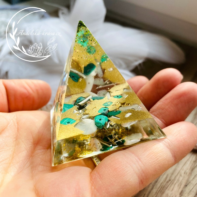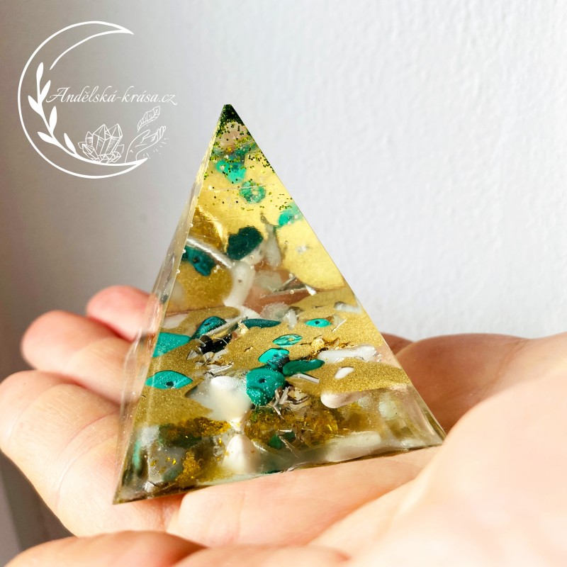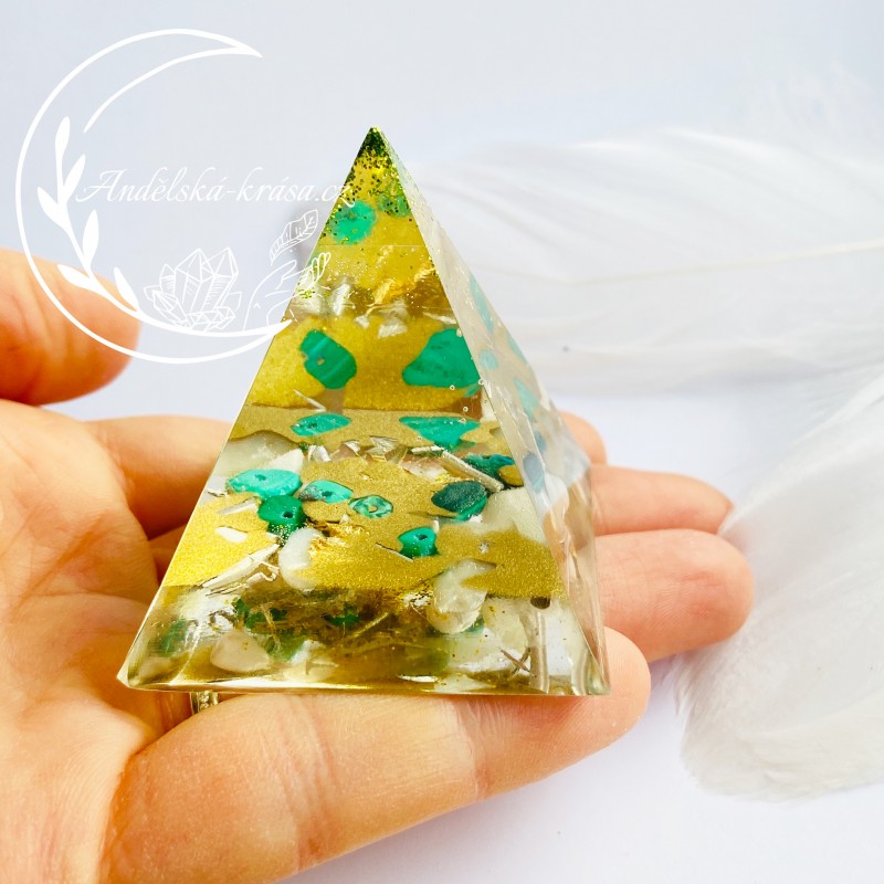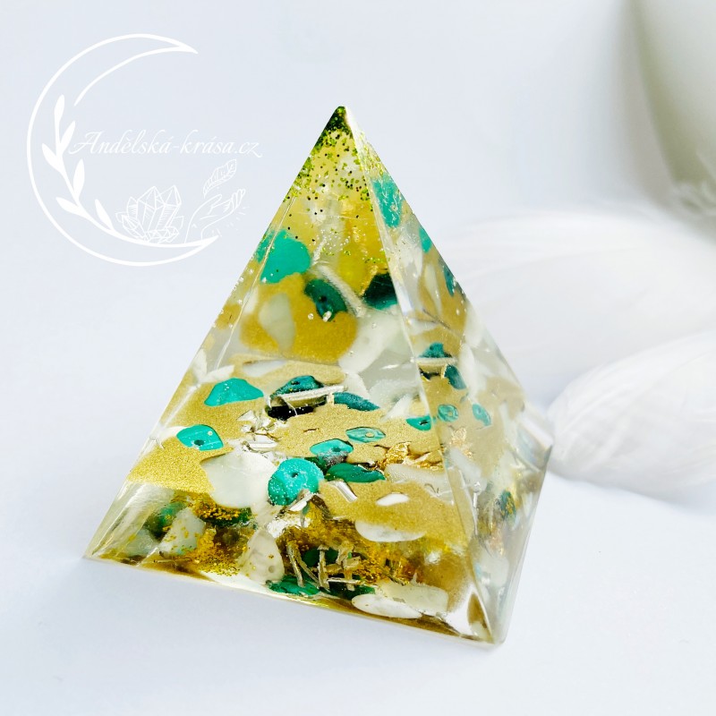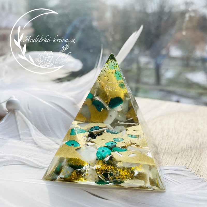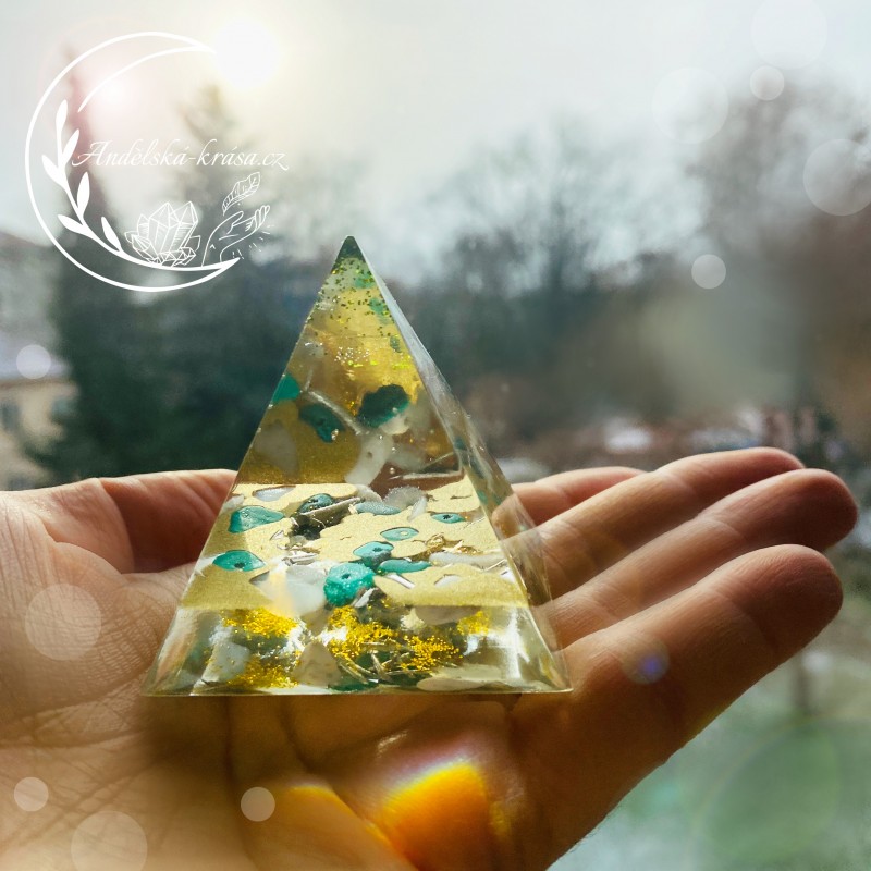 Energetická orgonitová pyramida přinášející hojnost, radost, štěstí a uvolnění. Prozáří Váš Domov laskavou, čerstvou energií a naplní Vaše srdce láskou. Nabíjí energií, očišťuje nás i domov od negativních energií a patogenních zón.