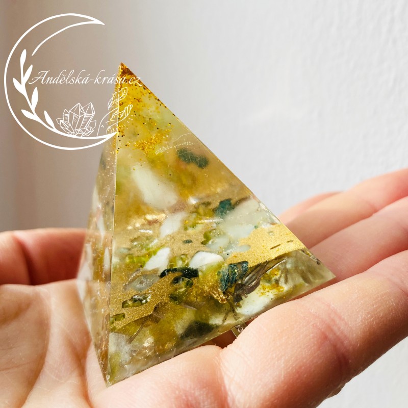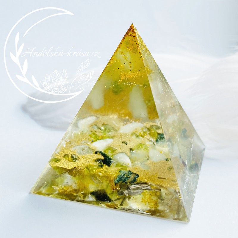 Energetická orgonitová pyramida přinášející vnitřní ovnováhu, vyrovnanost, harmonii a uvolnění. Pomáhá napojit se na Matičku Zemi. Přináší hojnost. Prozáří Váš Domov laskavou, čerstvou energií a naplní Vaše srdce láskou. Nabíjí energií, očišťuje nás i domov od negativních energií a patogenních zón.