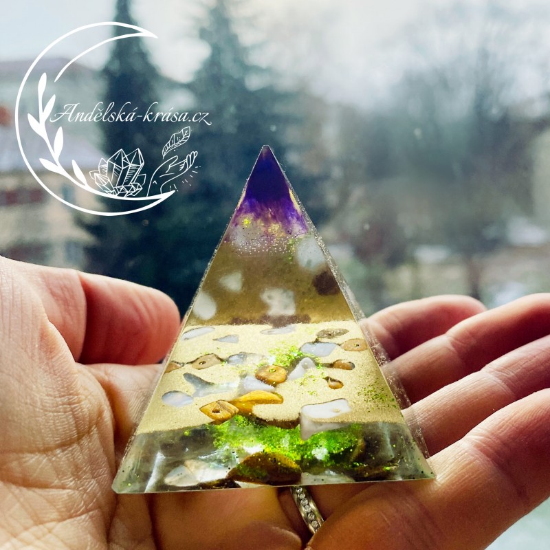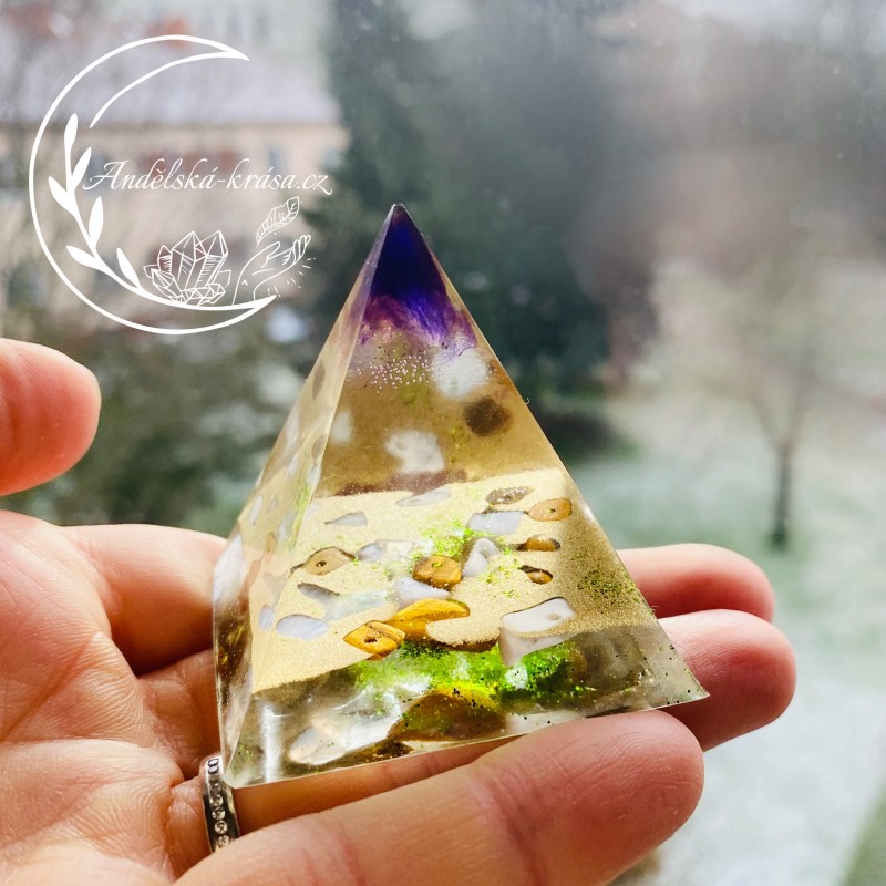 Energetická orgonitová pyramida přinášející hojnost, podporuje důvěru v sebe a odhodlání uskutečnit naše sny a dosáhnout cíle. Prozáří Váš Domov laskavou, čerstvou energií a naplní Vaše srdce láskou. Nabíjí energií, očišťuje nás i domov od negativních energií a patogenních zón.