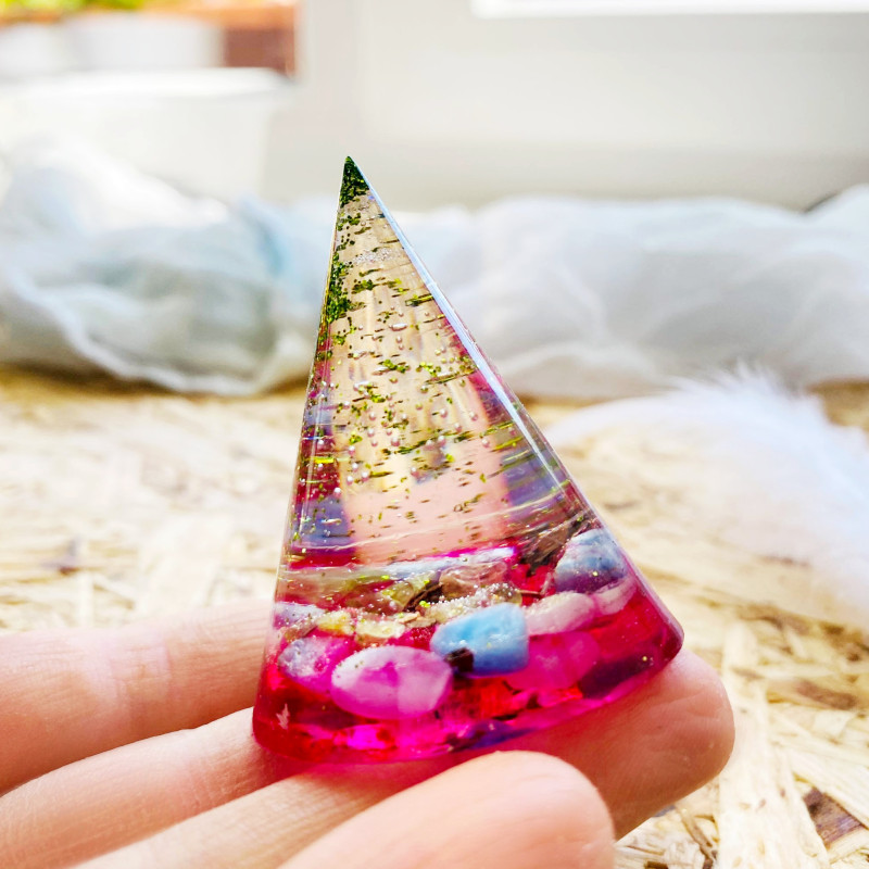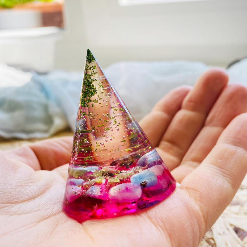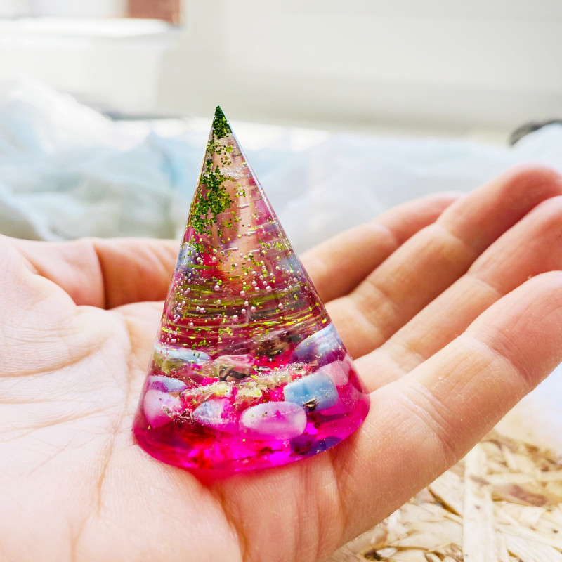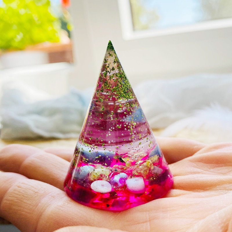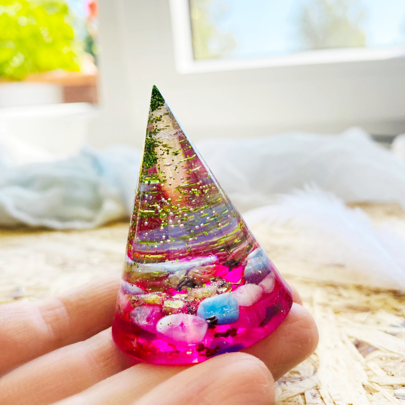 Energetický a magický orgonitový kužel s minerály.