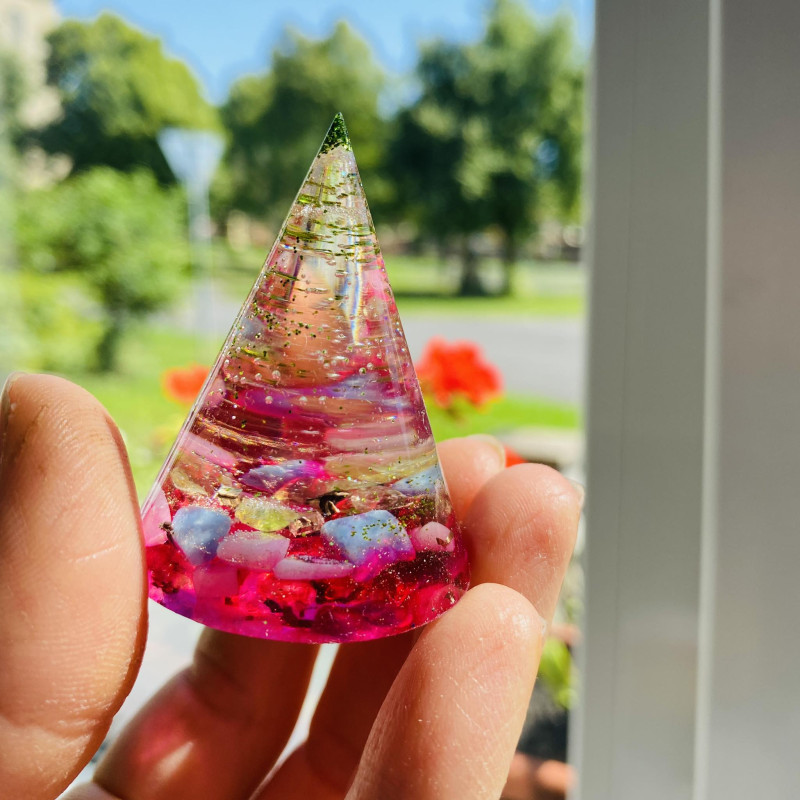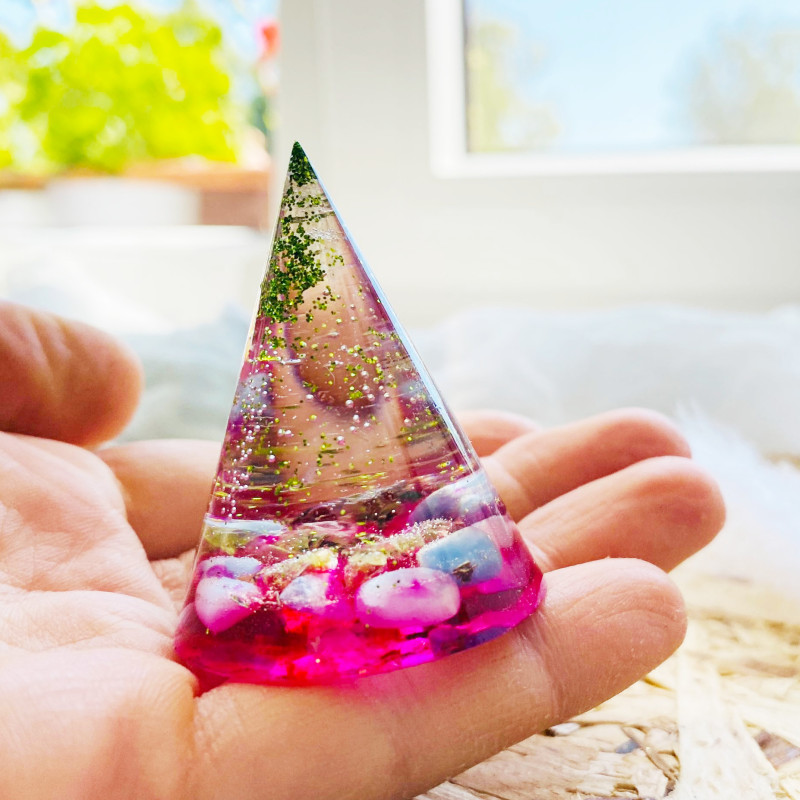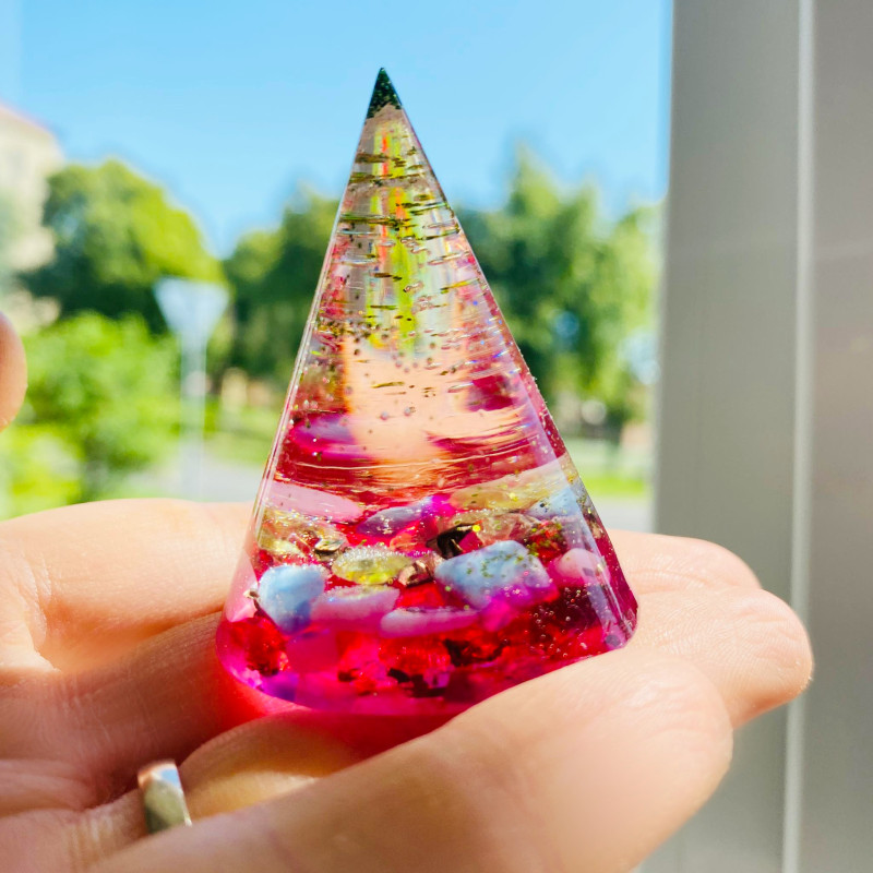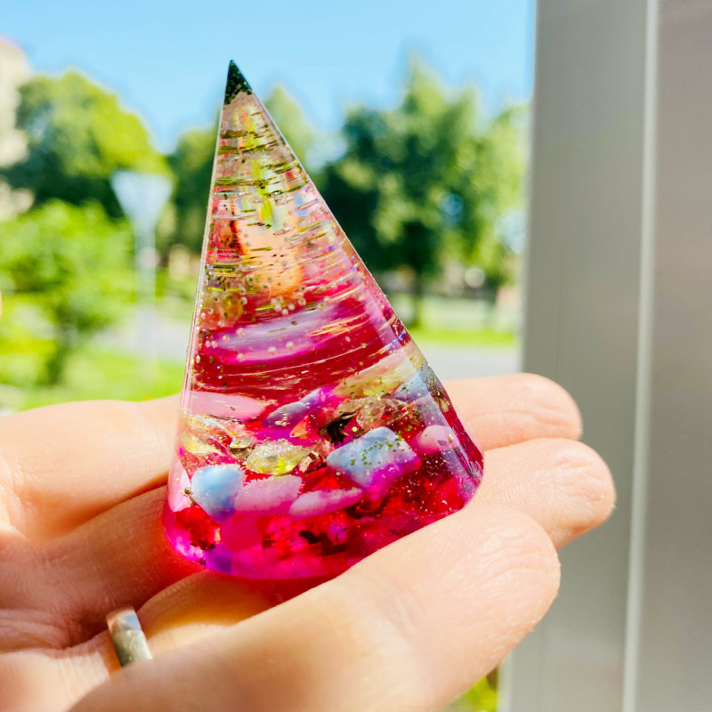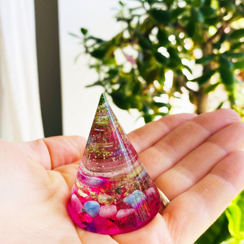 Energetický a magický orgonitový kužel s minerály.