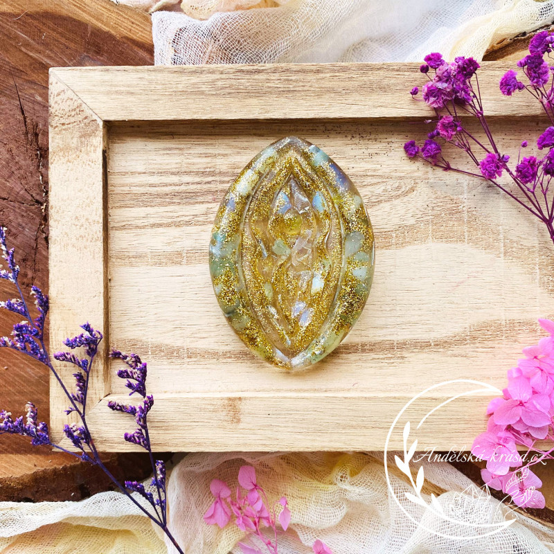 Amulet pro ženský oltář a rituály v ženských kruzích. Umocněn plátky zlaté barvy pro zvýšení toku energie.