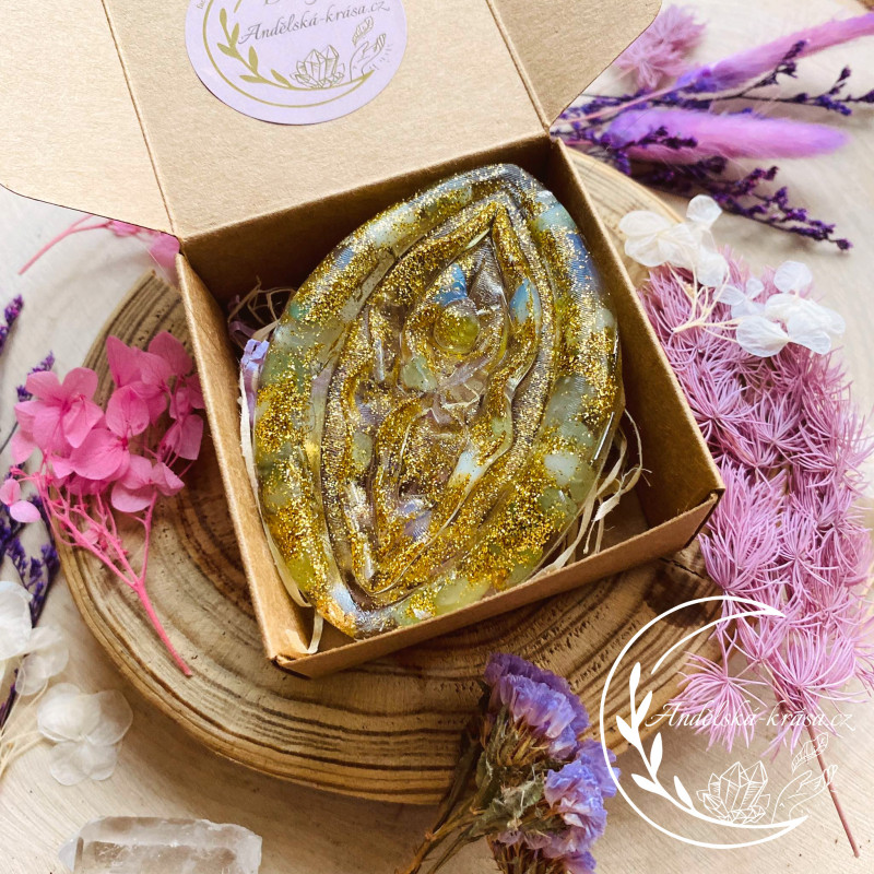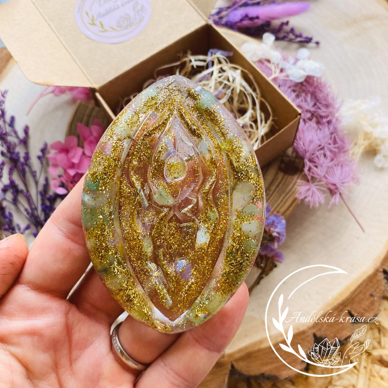 Orgonit v podobě Yoni s minerály na podporu spokojeného bytí, přinášející hojnost a prosperitu.