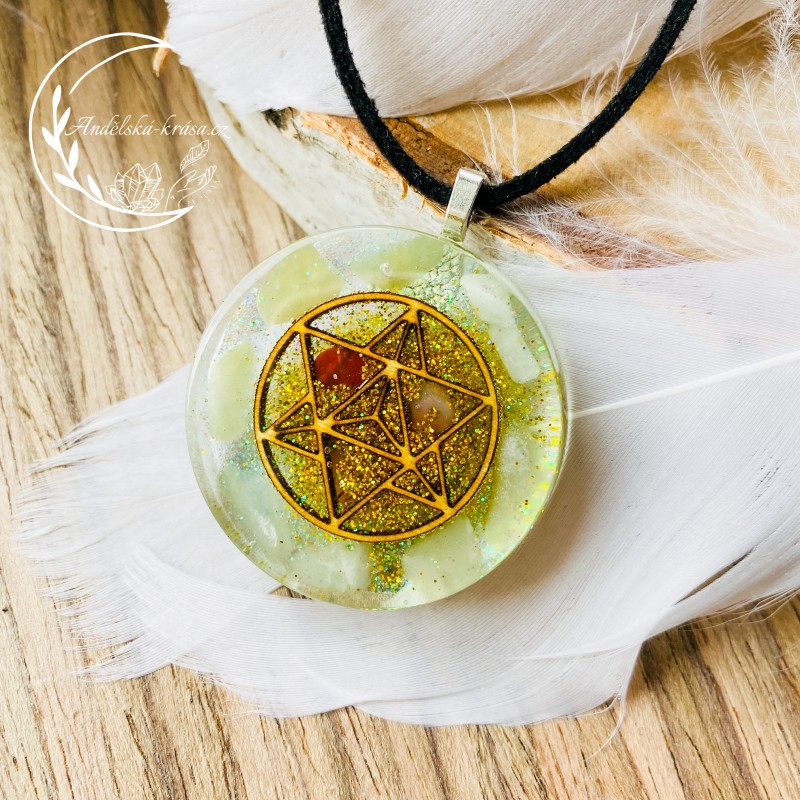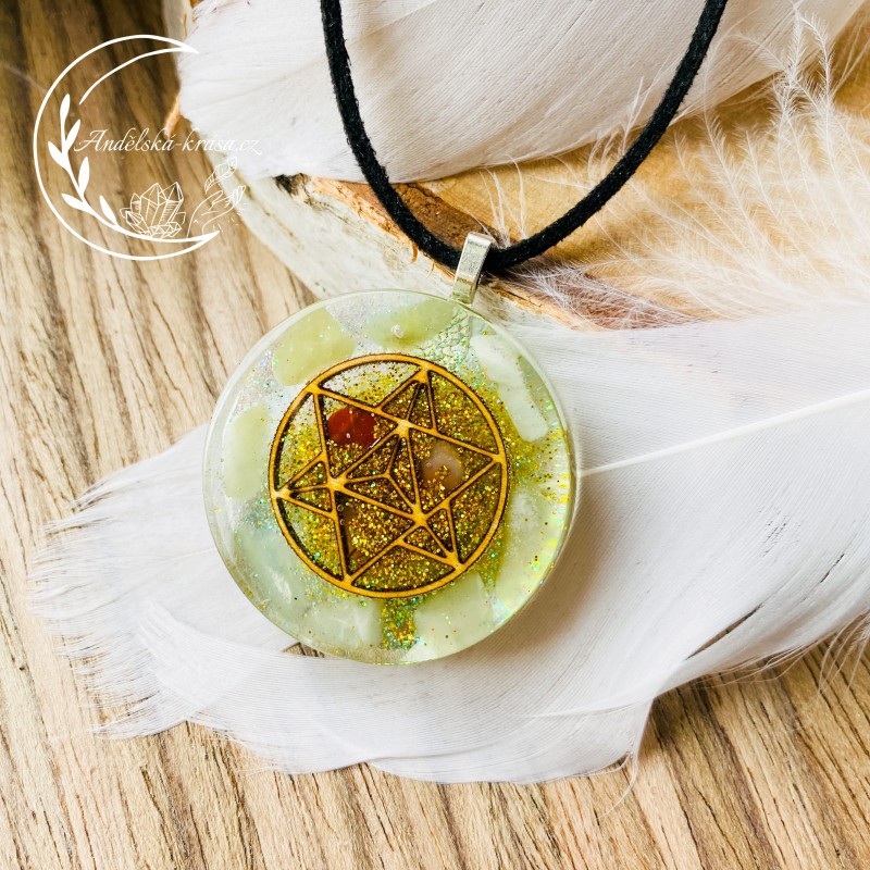 Vysoce energetický orgonitový náhrdelník Merkaba. Se vzácnámi minerály ochraňuje nositele. Pomáhá na nervovou soustavu, podporuje uvolnění, přivádí do života lásku a včelé milující osoby.