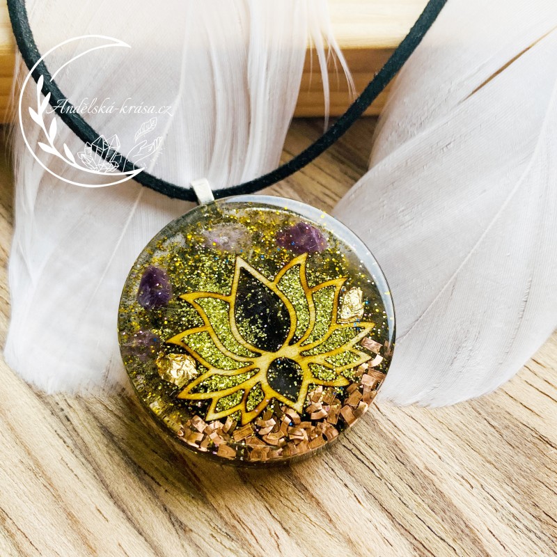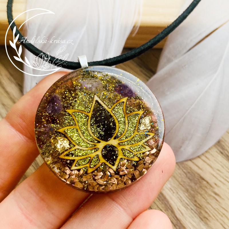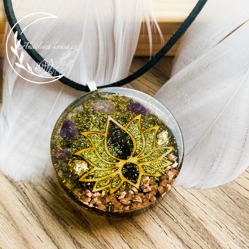 Orgonitový náhrdelník Lotosový květ, vysoce vibrační a energetický. Pomůže nám splnit vše, co si z hlouby srdce přejeme. Je spojnicí duší a duchovna. Orgonit chrání a očišťuje, podporuje uvolnění, soustředění, přináší laskavé osoby, hojnost, dodává odvahu.