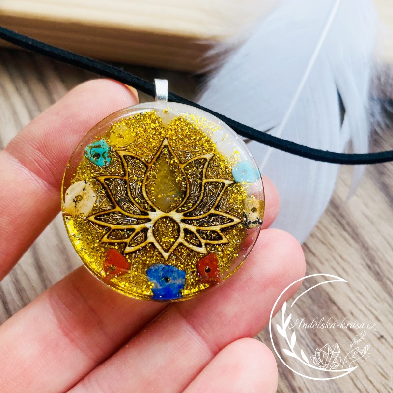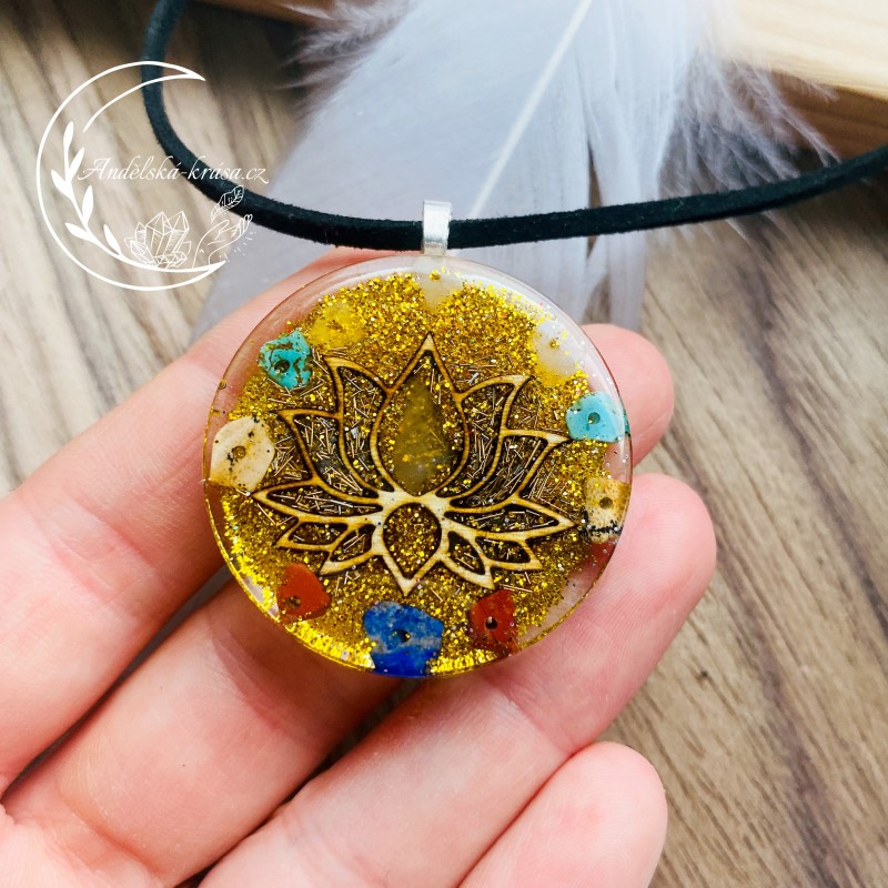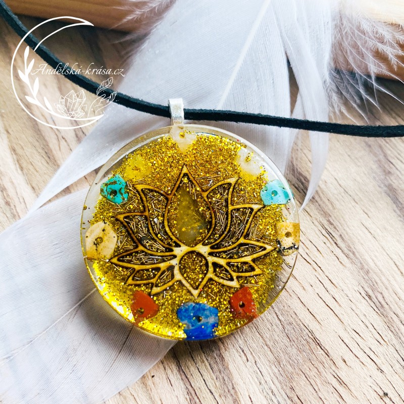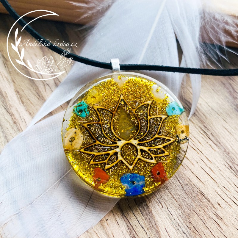 Vysoce energetický orgonitový náhrdelník Lotosový květ. Se vzácnámi minerály ochraňuje nositele. Podporuje radost, přináší štěstí a hojnost. Posiluje víru v sebe. Vnáší světlo do života a přináší milující lidi.